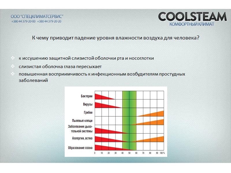 Оптимальное значение влажности воздуха для человека, которое способствует нормальному теплообмену, составляет 45–60% относительной влажности. Если этот показатель меньше, то по истечении нескольких часов можно почувствовать упадок сил и сонливость. От врачей в осенне-зимний период мы слышим советы о необходимости больше бывать на свежем воздухе и регулярно проветривать помещение, поскольку при сухом воздухе пересыхают слизистые, что создает благоприятные условия для попадания в организм человека болезнетворных вирусов и бактерий. Эта проблема особенно актуальна если в доме маленькие дети. В период отопительного сезона влажность воздуха в помещении может снизиться до 30%. При таких показателях малыши, особенно в первые месяцы жизни, просто атакуются вирусами и заболевают, поскольку слизистые носа и горла очень быстро пересыхают и сопротивляемость детского организма значительно снижается.