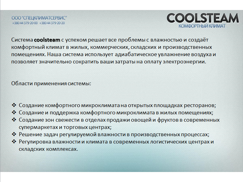 Компания «Спецклиматсервис» является производителем ультразвукового увлажнителя воздуха не требующего долива воды (стационарное подключение к водоснабжению). Уточнить информацию о увлажнителях компании «Спецклиматсервис», узнать о ценах и сделать заказ вы можете позвонив по телефонам в Киеве: +380 44 379-20-00 +380 44 379-20-20