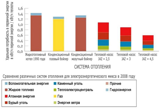 Именно эти вопросы анализирует доктор технических наук, профессор Ульрих Вагнер (Ulrich Wagner), Кафедра Энергетики и Прикладной Методики (IfE) при Мюнхенском Техническом Университете, в своем научном изыскании под названием „Энергопромышленная Оценка Теплового Насоса в Отоплении Зданий“. Данное исследование сравнивает потребление первичной энергии и эмиссию CO2 тепловых насосов с газовыми и мазутными конденсационными отопительными котлами и ранними жидкотопливными системами – с точки зрения энергетических составляющих электрогенерирующего микса (Strommix) для 2008 и 2030 года соответственно, на основе суммарного годового коэффициента эффективности (Jahresarbeitszahl, JAZ). Детально изучены были также воздействия дальнейшего количественного прироста тепловых насосов на существующий парк электростанций.