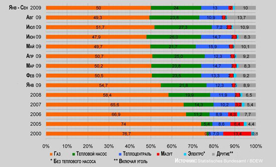 © AGEB. Отопление новых жилых объектов в Германии с 2000 до сентября 2009 года.