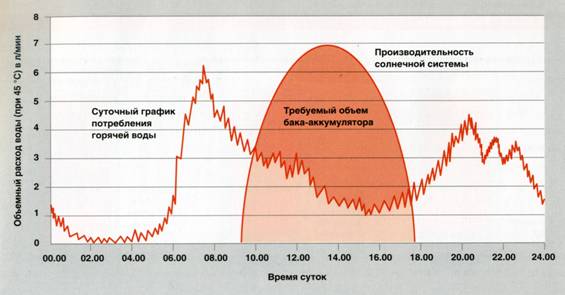 Становится ясно, что потребность в тепловой энергии и энергия, произведенная солнечными системами, не совпадают не только по количеству а и по временным характеристикам – в отличие от установок с традиционными теплогенераторами, где тепловая энергия может быть представлена по требованию. По этой причине в солнечных системах теплоснабжения особое значение имеют емкостные водонагреватели, то есть баки-аккумуляторы, обеспечивающие надежное хранение теплоты полученной из солнечной энергии.