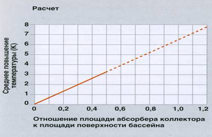 Этот график показывает связь между отношением площади поверхности бассейна и площади абсорбера солнечного коллектора и повышением температуры. В качестве базового значения «естественной» средней температуры воды в бассейне в разгар лета принимается температура 20°С. По опыту известно, что повышение температуры на 3-4К достаточно для достижения комфорта. Этого можна достичь с помощью солнечной системы с площадью коллектора, которая равна половине площади поверхности бассейна.
