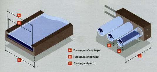 Площадь брутто — описывает внешние размеры коллектора и равна произведению его длины на ширину. Для определения производительности коллектора или его оценки площадь брутто не имеет никакого значения, она важна для планирования места с монтажа и выбора транспортных средств.