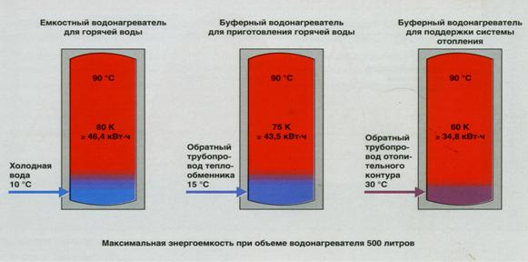 Как правило для аккумулирования теплоты используется вода – недорогой, доступный и технически легко управляемый теплоноситель (нагрев, наполнение, слив). Решающее значение при выборе емкостного водонагревателя (бака-аккумулятора) имеет не его обьем, а энергоемкость. Энергоемкость зависит от температурного диапазона: чем он больше, тем больше энергоемкость на единицу объема бака-аккумулятора.