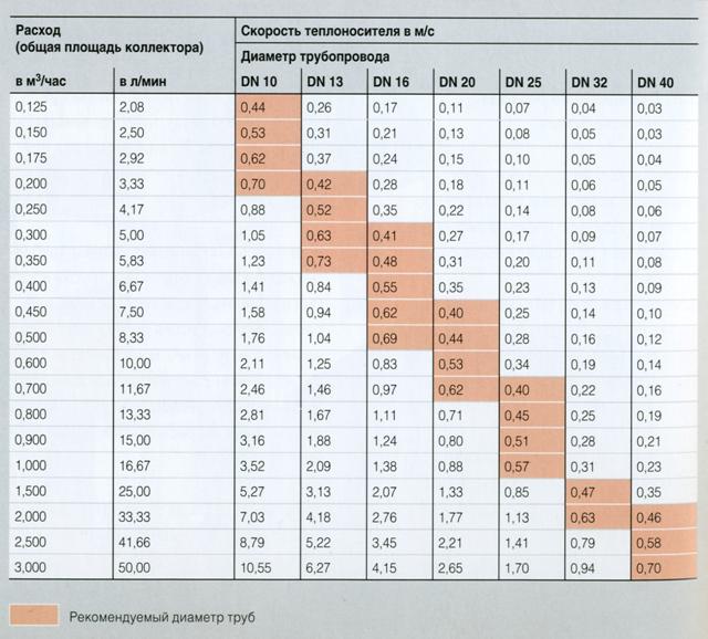 Решающее значение для определения диаметра трубопровода гелиоконтура имеет скорость потока при расчетном расходе теплоносителя.