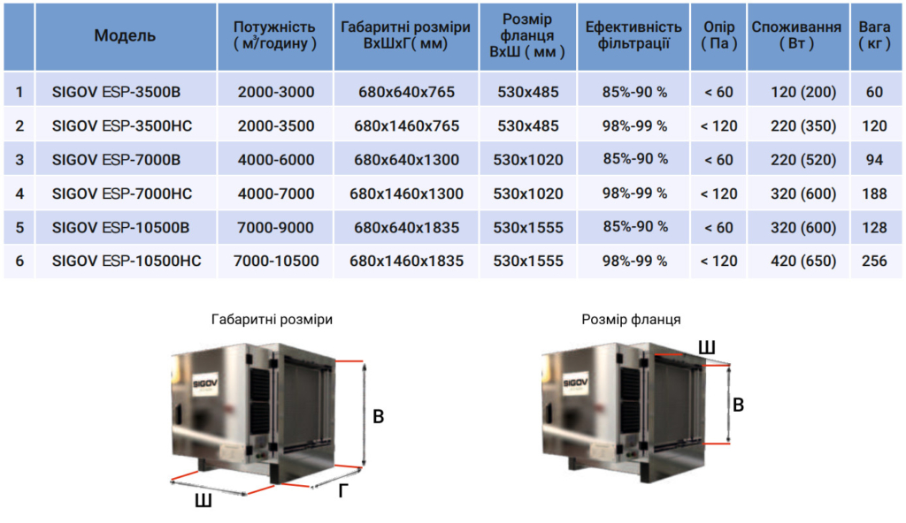 Технічні характеристики електростатичних фільтрів SIGOV